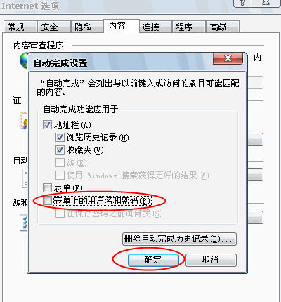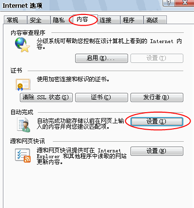 4. 如果您希望浏览器不再保存邮箱名和密码,请选择“内容”标签,在“自动完成”一栏点击“设置”按钮: